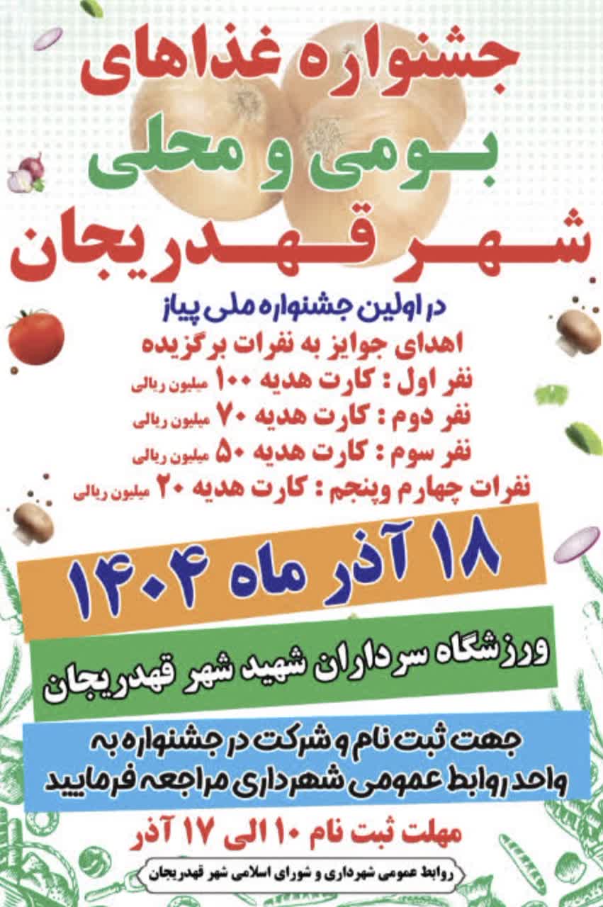 به گزارش پایگاه خبری نیوز فلاورجان، جشنواره غذاهای بومی و محلی شهر قهدریجان با میزبانی “نخستین جشنواره ملی پیاز و پیازکاران” برگزار میشود. این رویداد فرهنگی-اقتصادی در روزهای چهارشنبه و پنجشنبه، ۱۸ و ۱۹ آذرماه ۱۴۰۴، در سالن ورزشگاه سرداران شهید قهدریجان برپا خواهد شد. بر اساس اعلام روابط عمومی شهرداری، به برگزیدگان این جشنواره